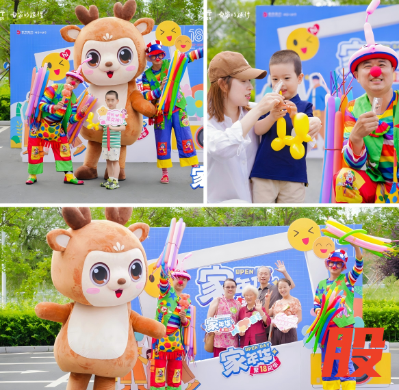 吉祥物小鹿穿梭其间,与孩子们击掌、合影,萌态十足的互动让笑声此起彼伏。