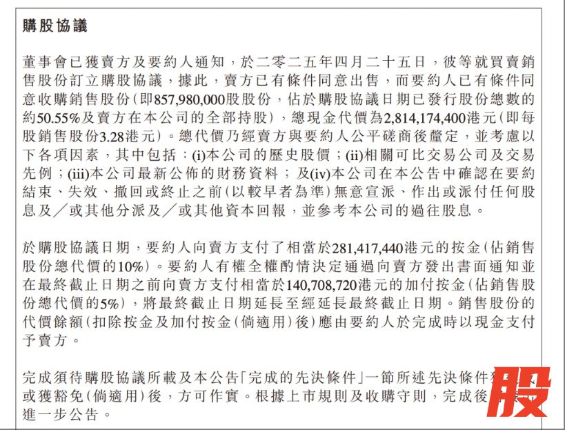 公告显示,买卖双方已于4月25日订立购股协议,交易股份约8.58亿股,占已发行股份总数的约50.55%,总现金代价为28.14亿港元融胜配资,且已支付了10%的按金。要约收购价格为3.28港元/股,较耀才证券最后交易日在香港联交所的收市价2.79港元/股溢价约17.6%。